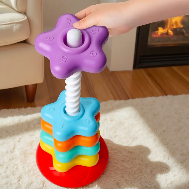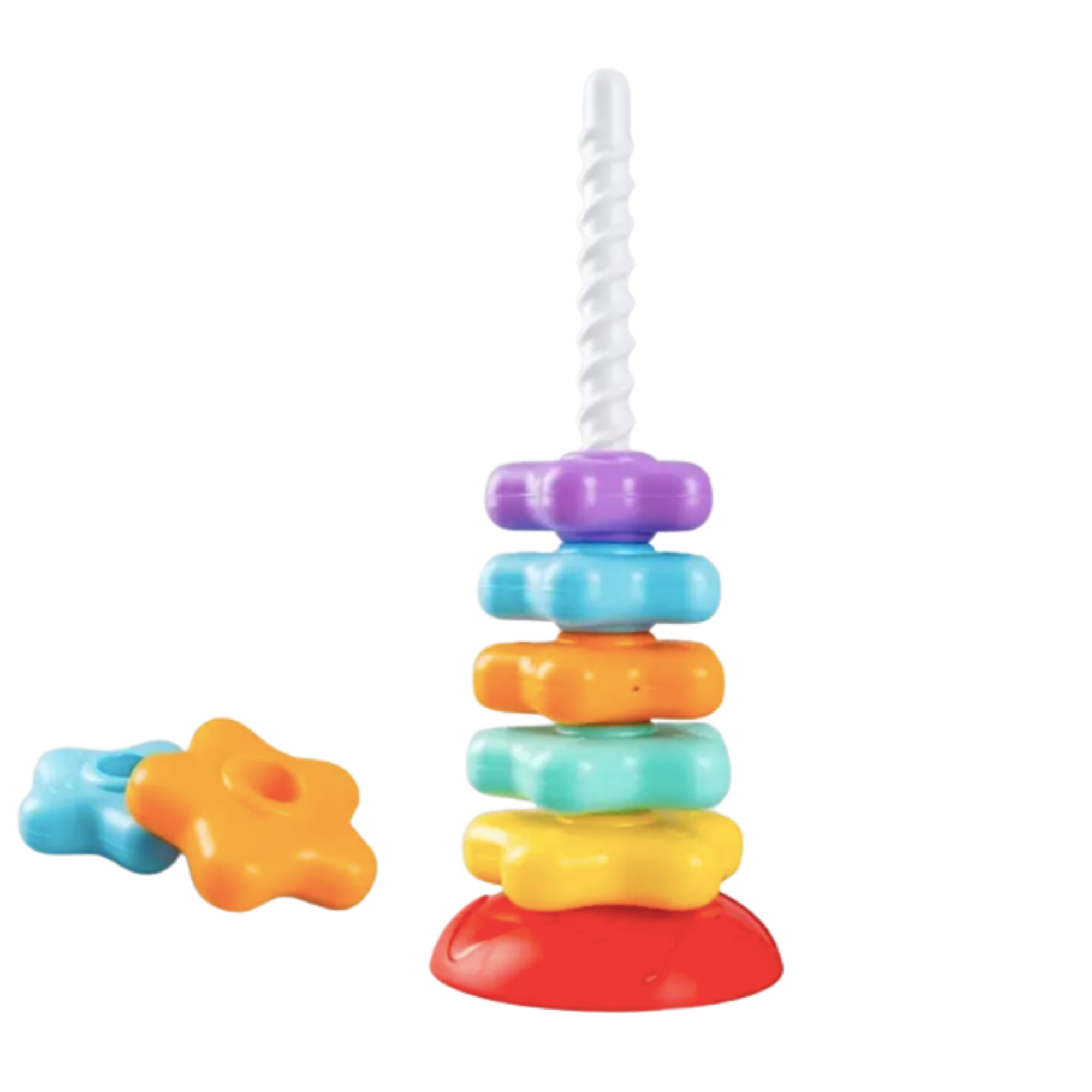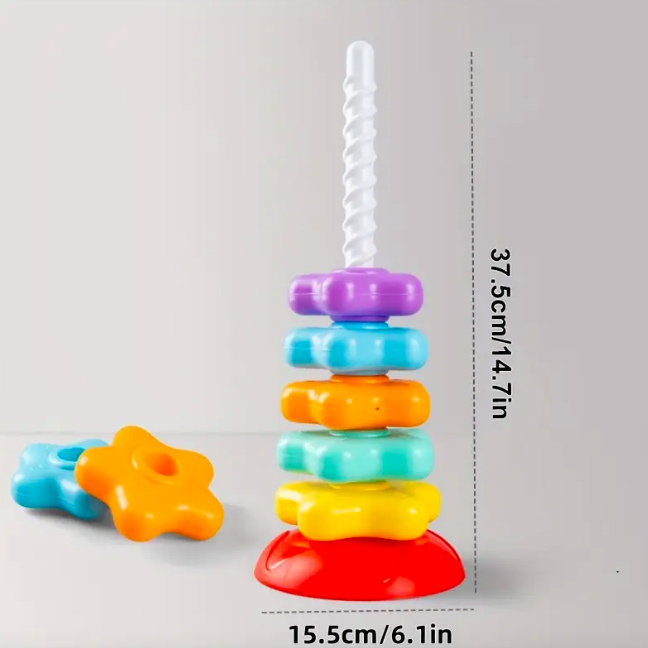 This colorful spiral stacking toy is designed to make early learning fun and interactive for toddlers. The set features five large, flower-shaped rings in bright colors that twist down a spiral pole, helping children develop fine motor skills, hand-eye coordination, and problem-solving abilities.